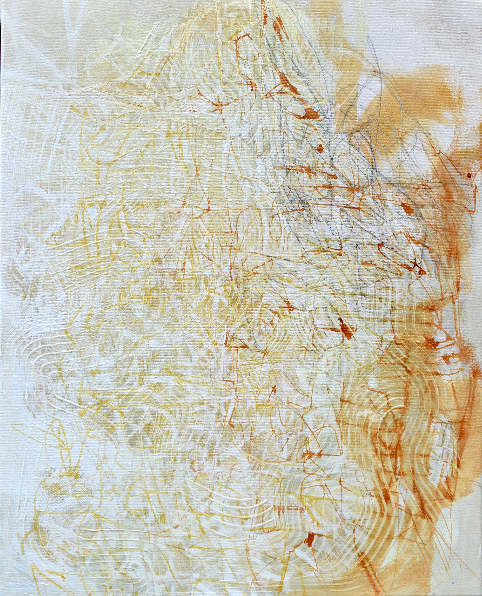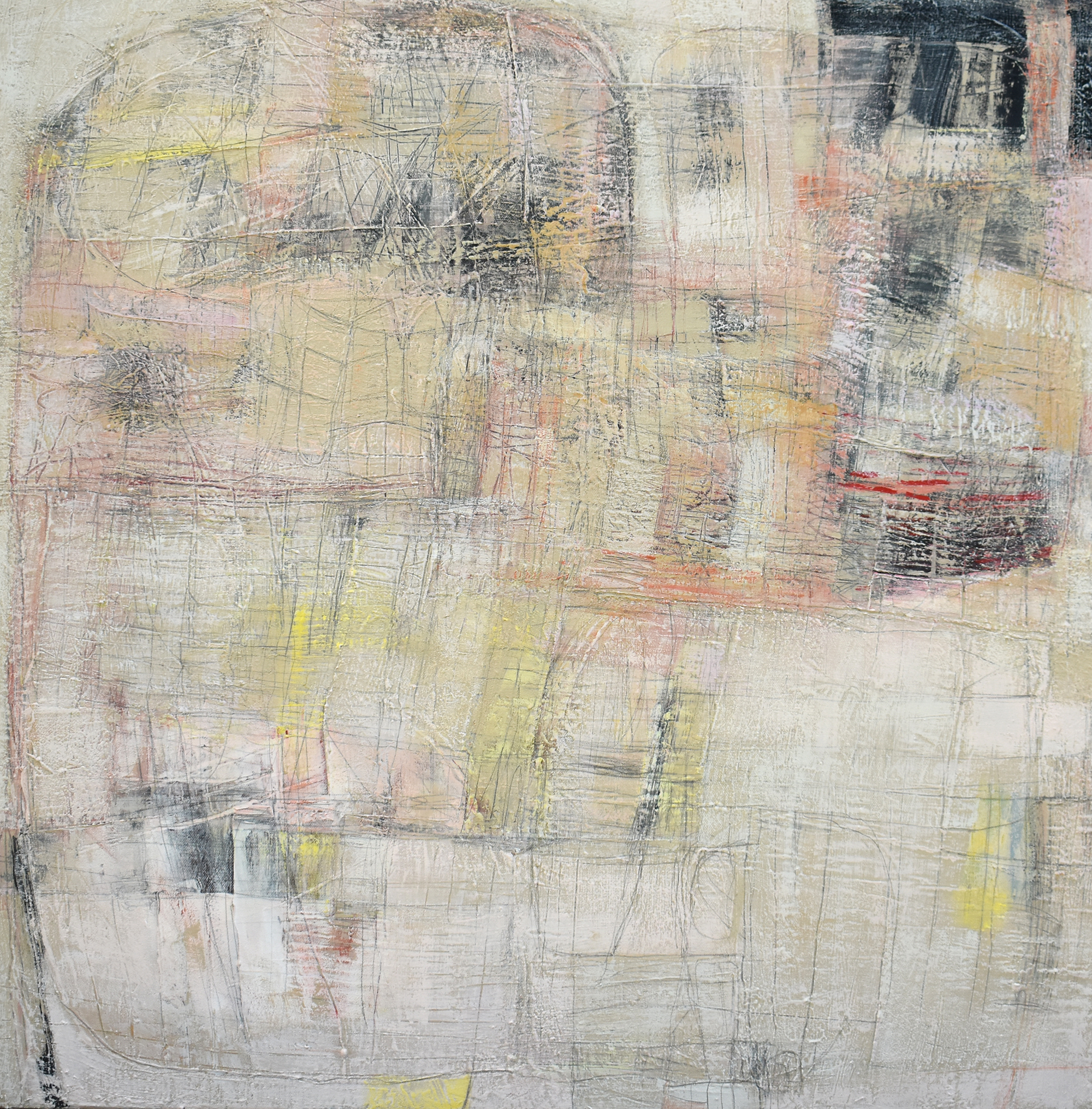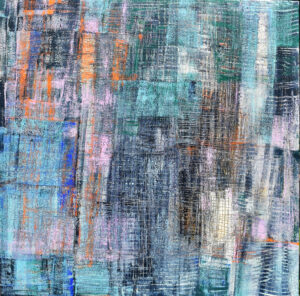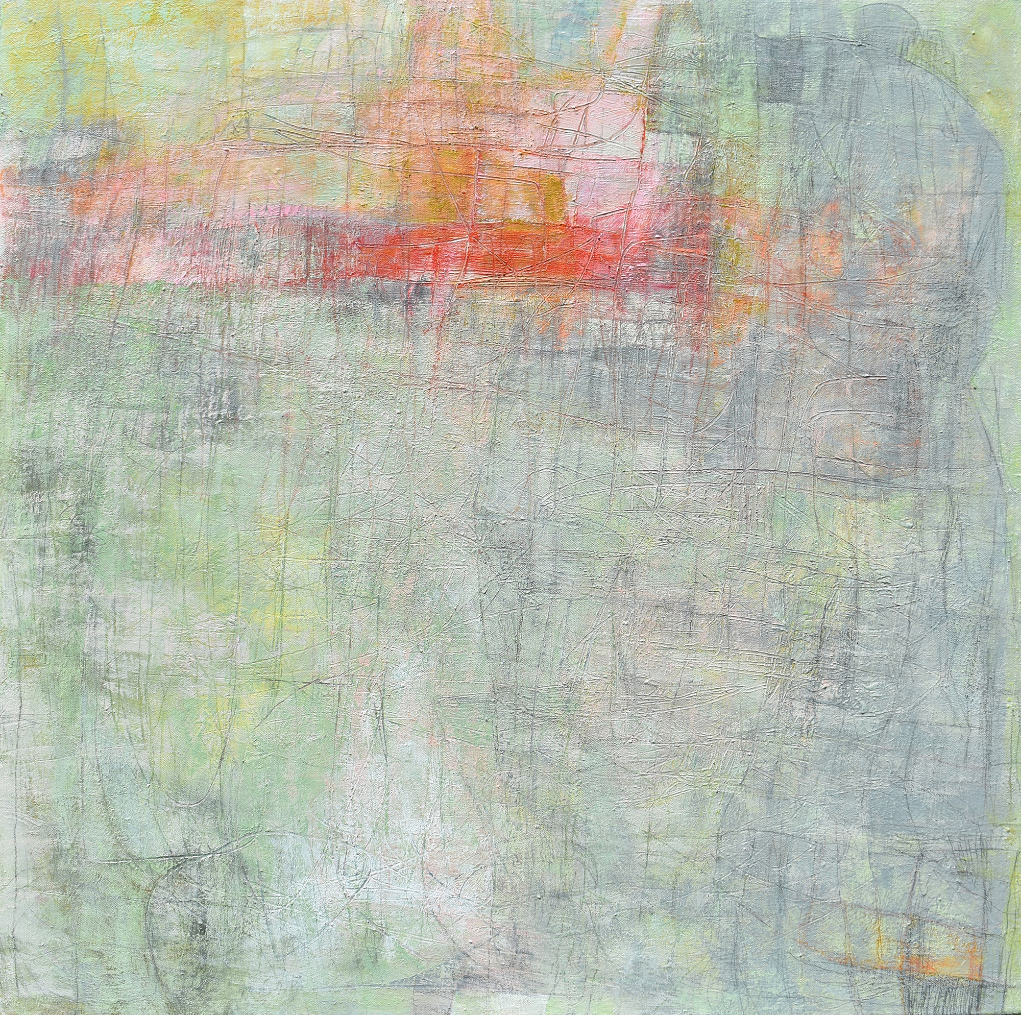 “Beyond the Field”, acrylic and dry media on canvas, 30″ x 30″