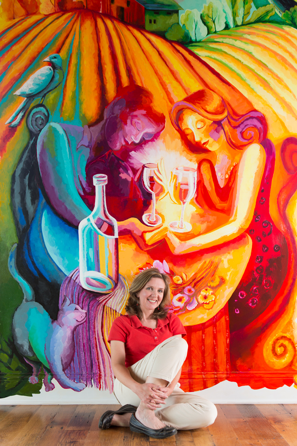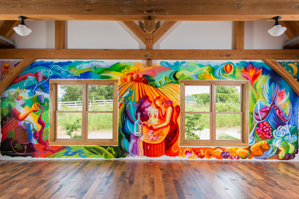 My mural is on view at Chestnut Oak Vineyard which is near my studio in Barboursville, VA. If you are touring the vineyards and would like to come to the studio also, contact me by email: carolsart@hughes.net Also be in touch with commission or collaboration projects, I would love to talk with you about them. I really enjoyed working with clients on the art for the wine labels and Chestnut Oak Vineyard adopted one of my graphics as their logo. Painting the art for the Kris Monson jazz album was also fun! I was inspired by their music while painting. The large paintings commissioned for private residencies was fulfilling. In both cases, I was free to create with color suggestions and a size. We all loved the results!