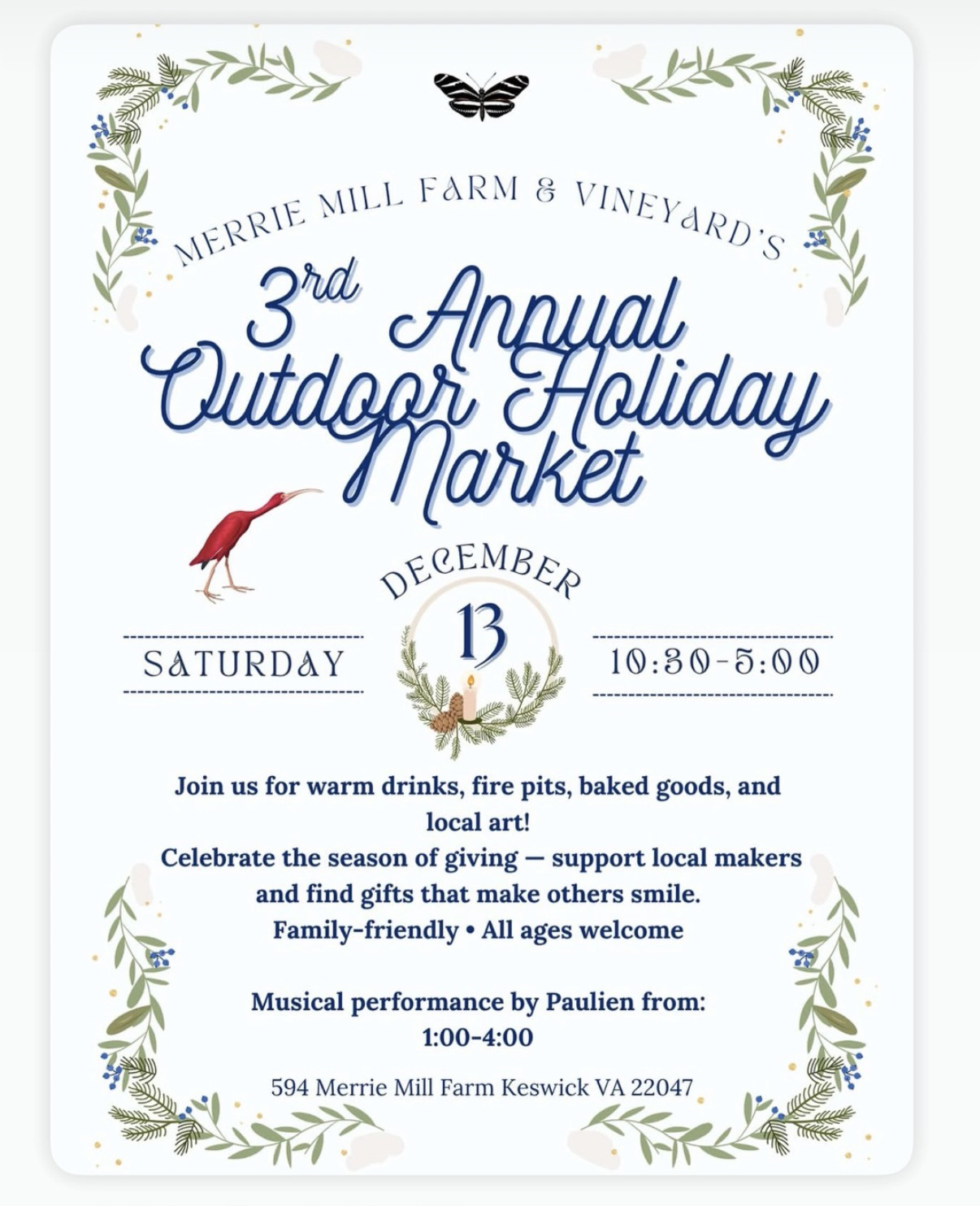 Bundle up for a Winter Outdoor Market at Merrie Mill Farm & Vineyard. Saturday, December 13, 10:30 – 5:00 pm. This should be a fun adventure! I will bring a variety of art pieces for this one-day event. Looking forward to seeing you there!